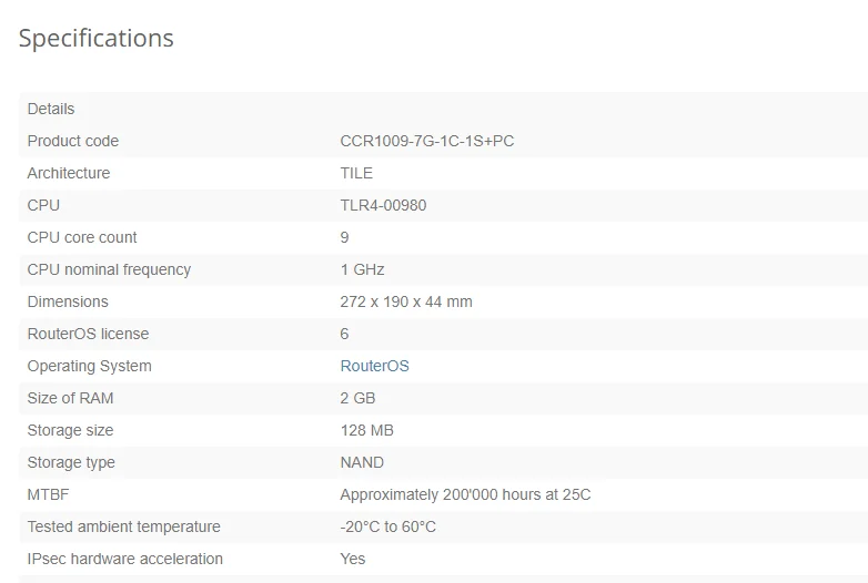 CCR1009-7G-1C-1S+PC7x Gigabit Ethernet, 1x Combo port (SFP or Gigabit Ethernet), 1xSFP+ cage, 9 cores x 1GHz CPU, 2GB RAM, LCD panel, passive cooling desktop enclosure, SmartCard slot, RouterOS L6, PSU