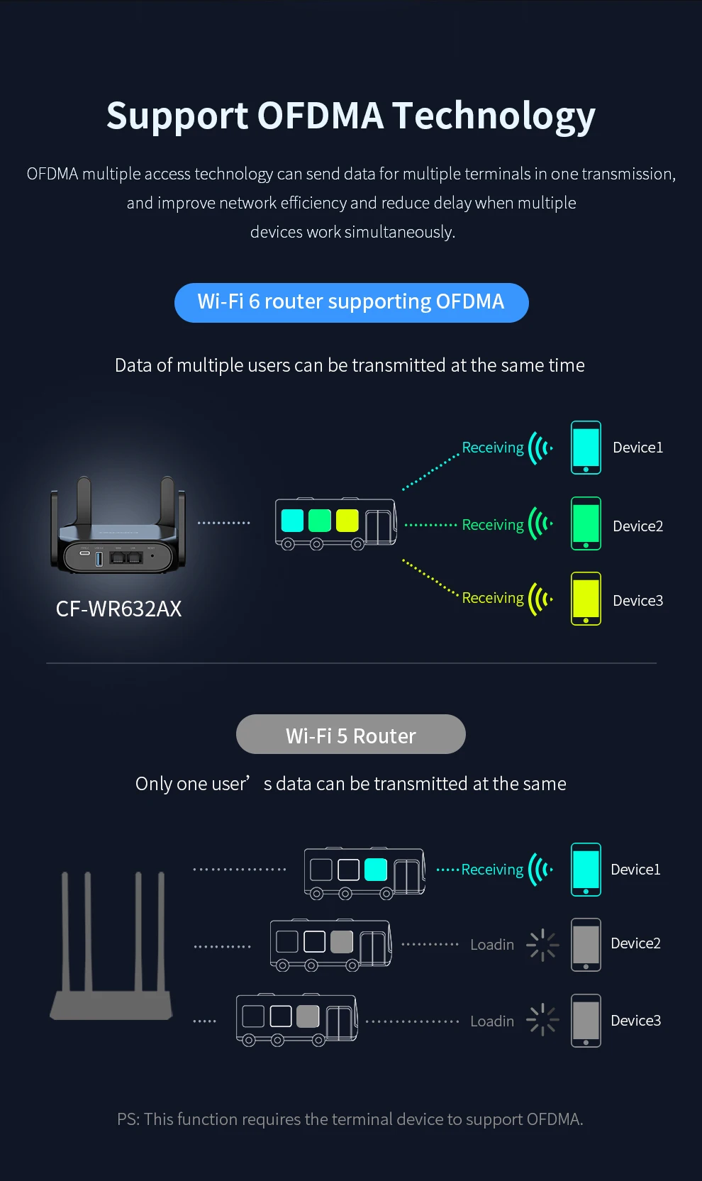 CF-WR632AX is a WiFi6 smart Mesh networking router with a wireless speed of up to 3000Mbps. It has many advantages such as high bandwidth, low latency, high efficiency, and large coverage. It is equipped with MESH functions, easy networking and mini portable design, which can achieve network coverage in various home environments, office environments, and complex environments.