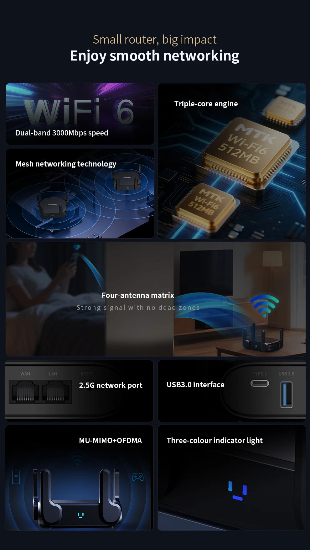 4. 3000Mbps wireless speed, high-speed transmission, and better internet experience;