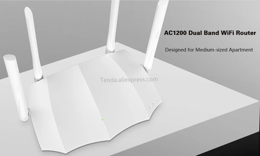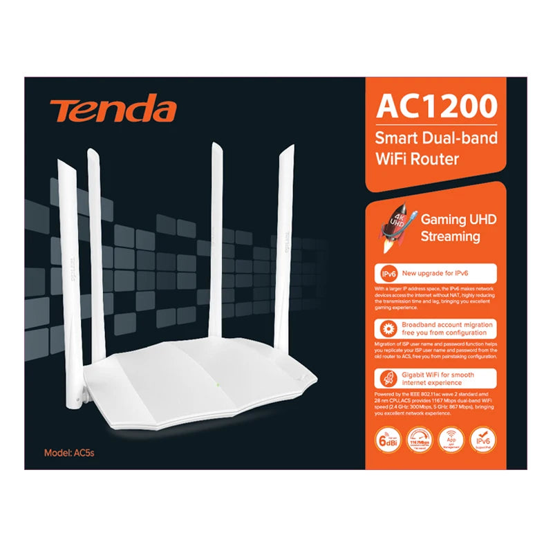 AC5 is an AC1200 dual band WiFi router, designed for medium-sized apartment with a 100Mbps fiber access. It provides WiFi speed up to 1167 Mbps (5GHz: 867Mbps and 2.4GHz: 300Mbps). Adopted the integrated dual-band technology, combining 2.4GHz and 5GHz signals under one WiFi name. The faster band would be allocated to your and 5GHz signals under one WiFi name. The faster band would be allocated to your 4*6dBi high-gain antennas and equipped with a 28nm high performance CPU, it brings a better internet experience. AC5 supports IPv6 protocol, it can reduce the data transmission time and minimize the lag. Furthermore, the remote management function by the Tenda WiFi App provides the easiest way to manage AC5s.