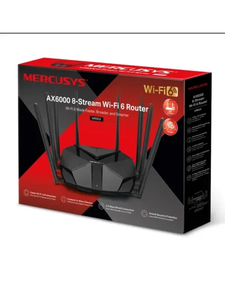 The Mercusys AX6000 MR90X is a high-performance home networking router designed to deliver optimal Wi-Fi 6 speeds of up to 6000 Mbps (4804 Mbps on 5 GHz and 1148 Mbps on 2.4 GHz). Powered by a 1.6 GHz Quad-core CPU, it features an 8-stream architecture with 4x4 MU-MIMO and OFDMA technologies, significantly reducing congestion and quadrupling average throughput for multiple devices simultaneously. Eight multi-directional high-gain antennas with Beamforming ensure extended coverage and stable connections throughout your home, while a 2.5 Gbps WAN/LAN port and multiple Gigabit LAN ports provide multi-gigabit wired connectivity.