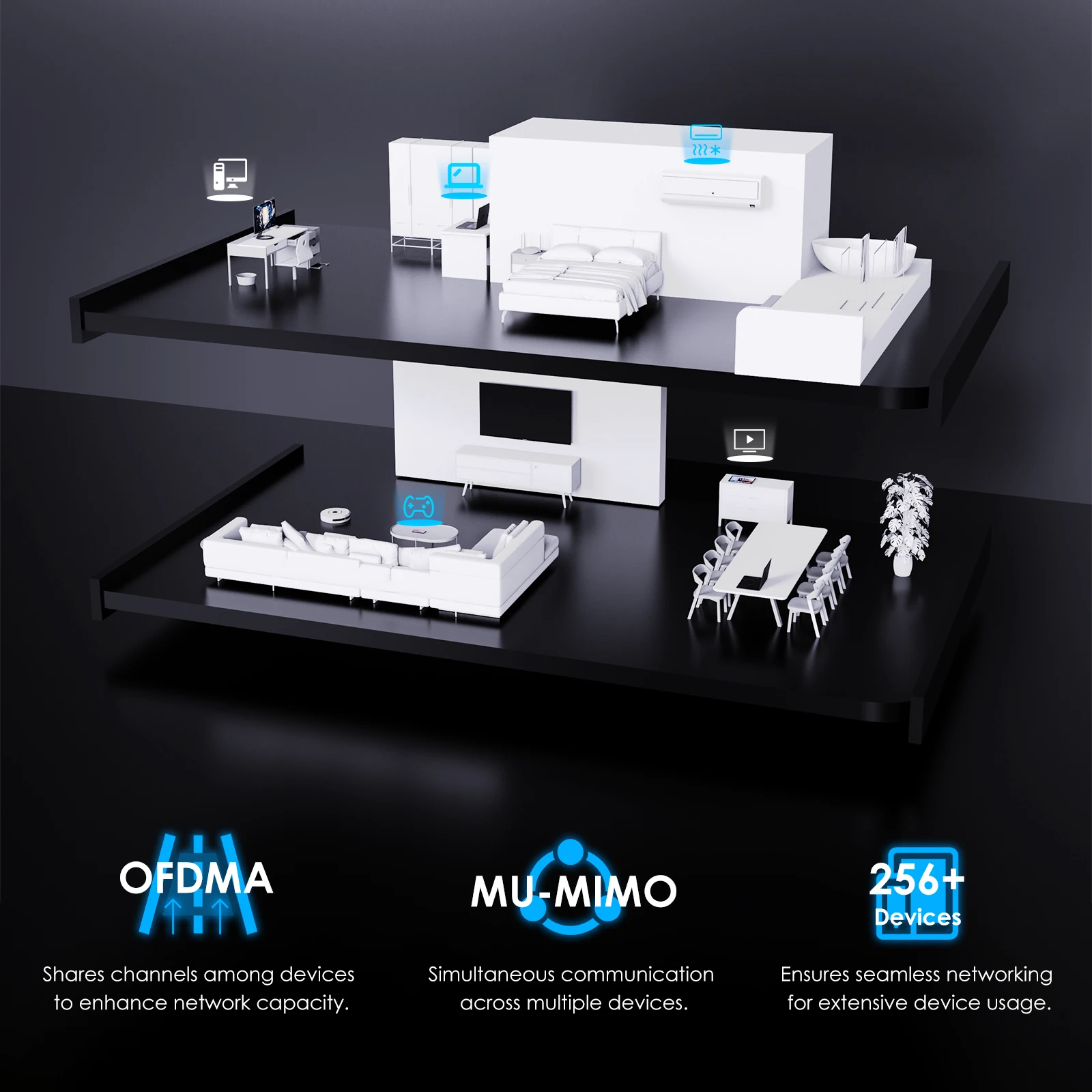 Reduce network congestion with OFDMA+MU-MIMO, enabling seamless sharing among up to 256 devices concurrently. Enjoy improved networking and minimized latency for an optimized experience.
