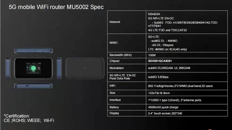 ZTE Unlocked 5G Router MU5002 Portable Dual Antenna WiFi 6 Wireless with Display 1800Mbps Support SIM Card Mobile Hotspot Modem