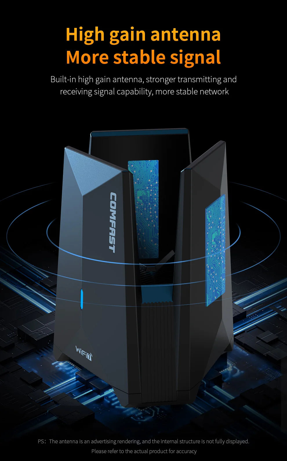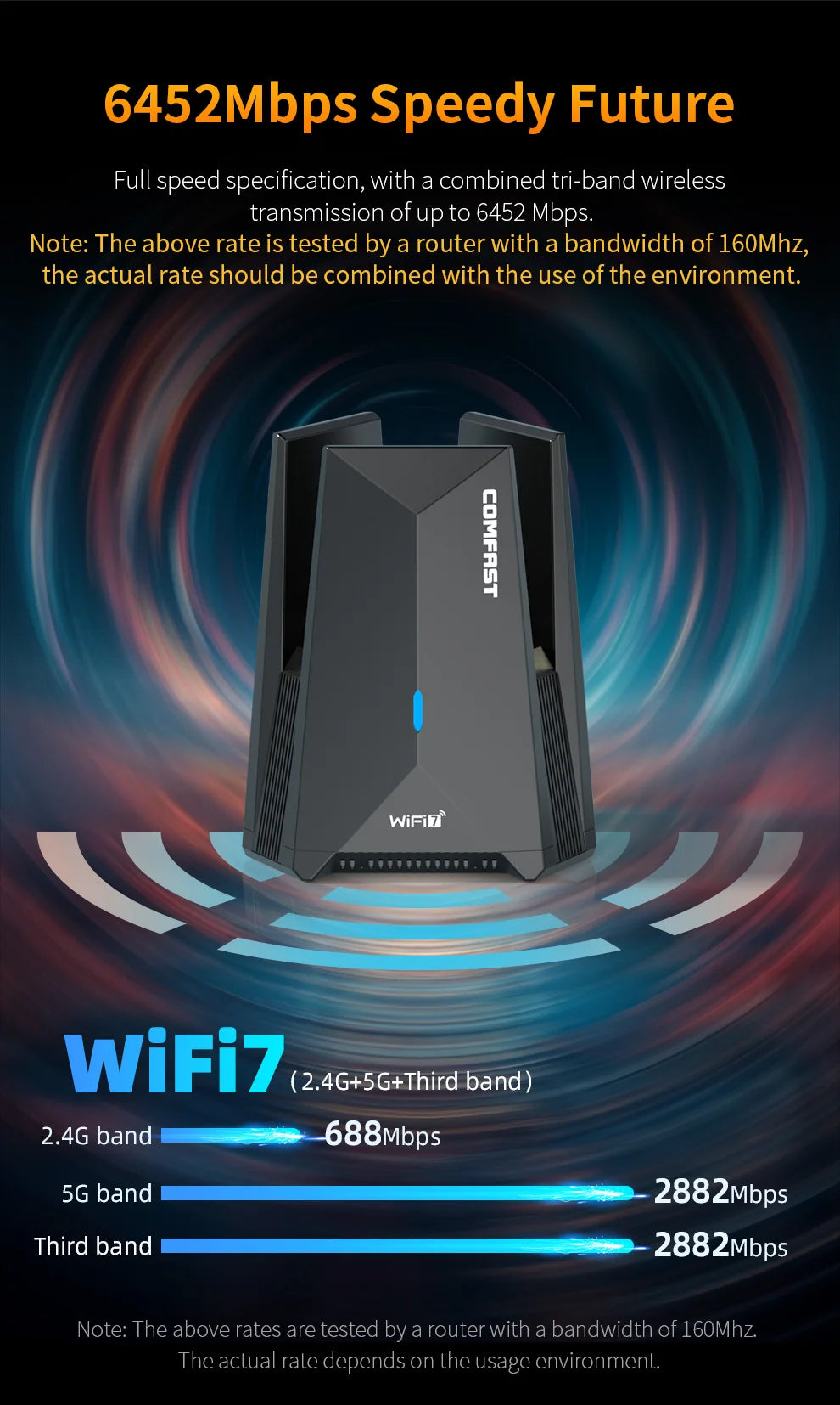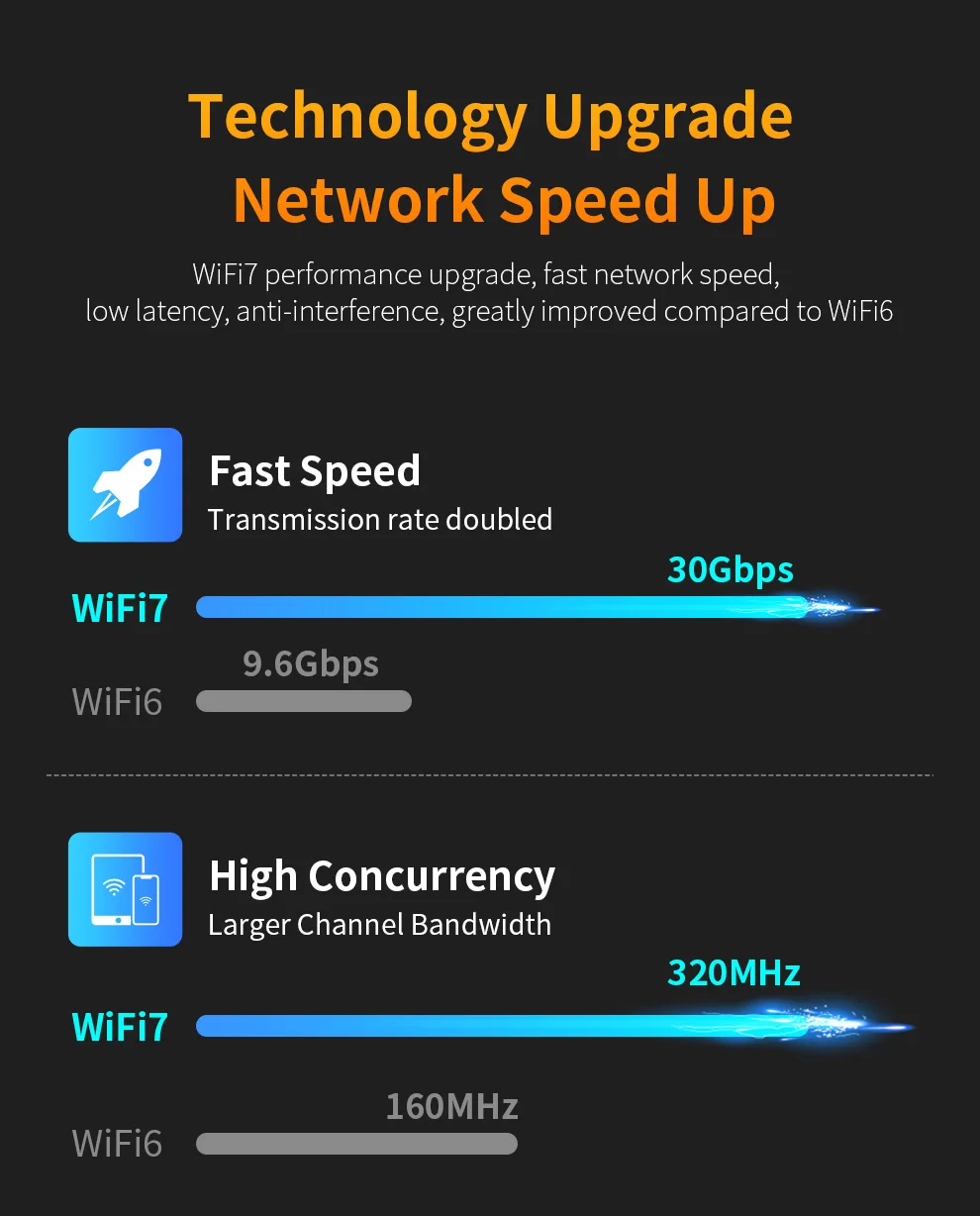 WiFi7 performance upgrade, fast network speed, low latency, anti-interference, compared with WiFi6 has been greatly improved6452Mbps Speedy Future