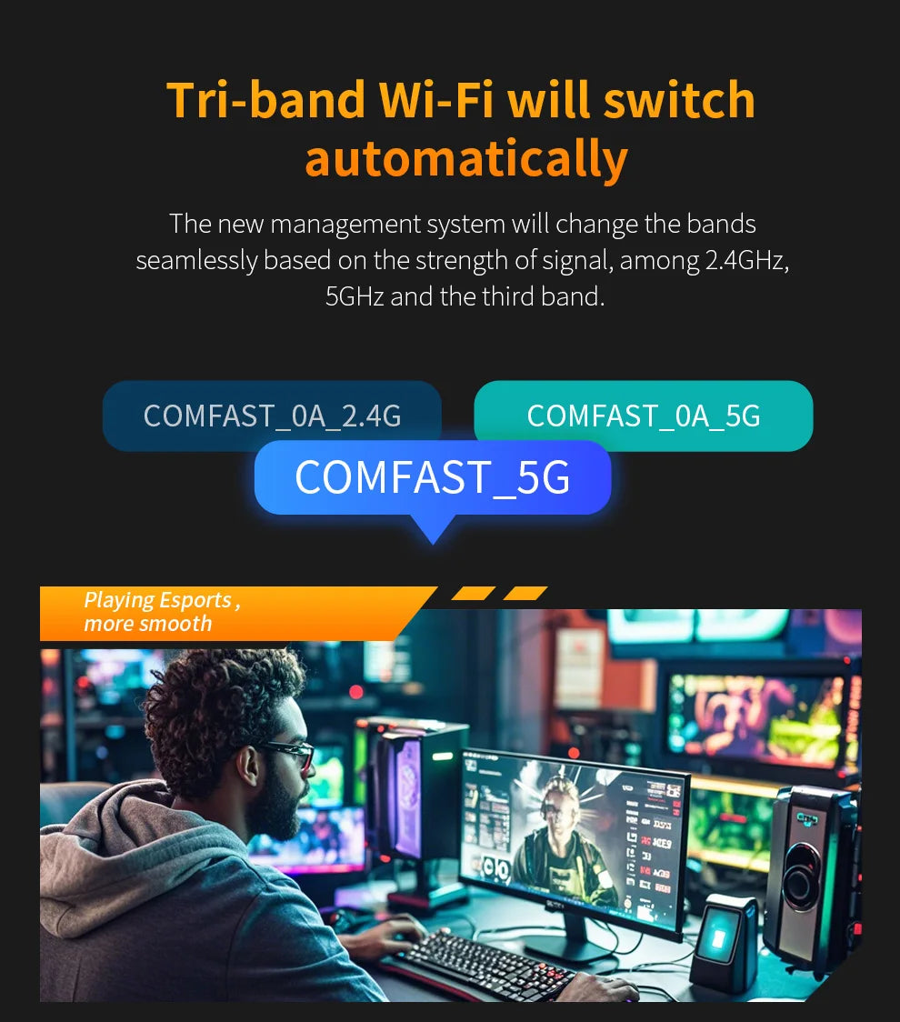 Full speed specification, with a combined tri-band wireless transmission of up to 6452 Mbps.