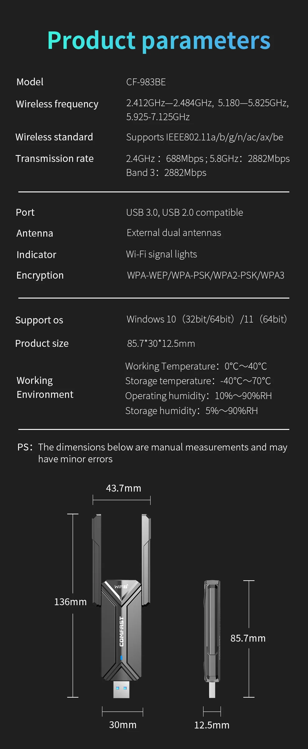 CF-983BE:Wifi 7 USB3.0 Driver Free BE6500 2.4&5&6GHz Tri-band 2 *4 dbi Antennas RTL8912AU WPA3 Windows 10/11