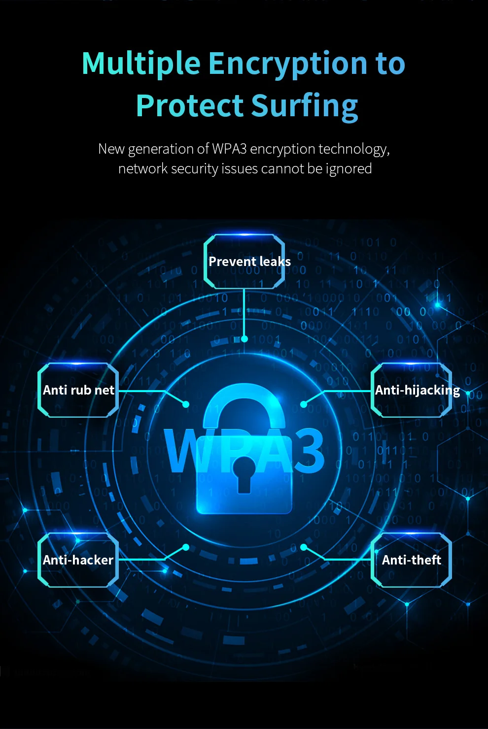 ● Support 2.4&5&6GHz tri-band(2.4GHz:688Mbps;5.8GHz:2882Mbps;6GHz:2882Mbps)