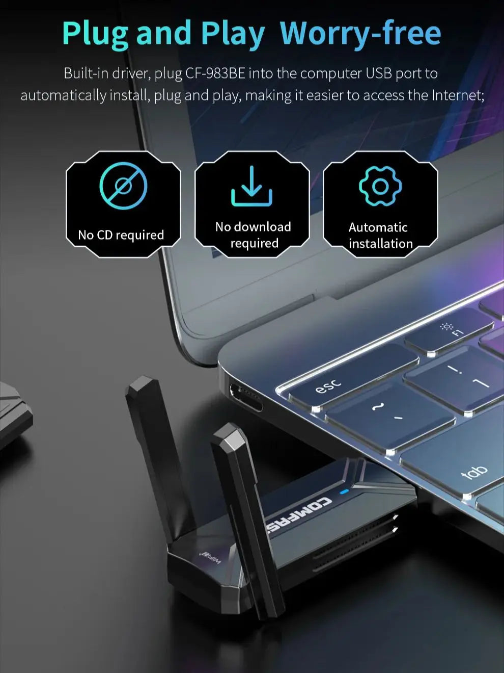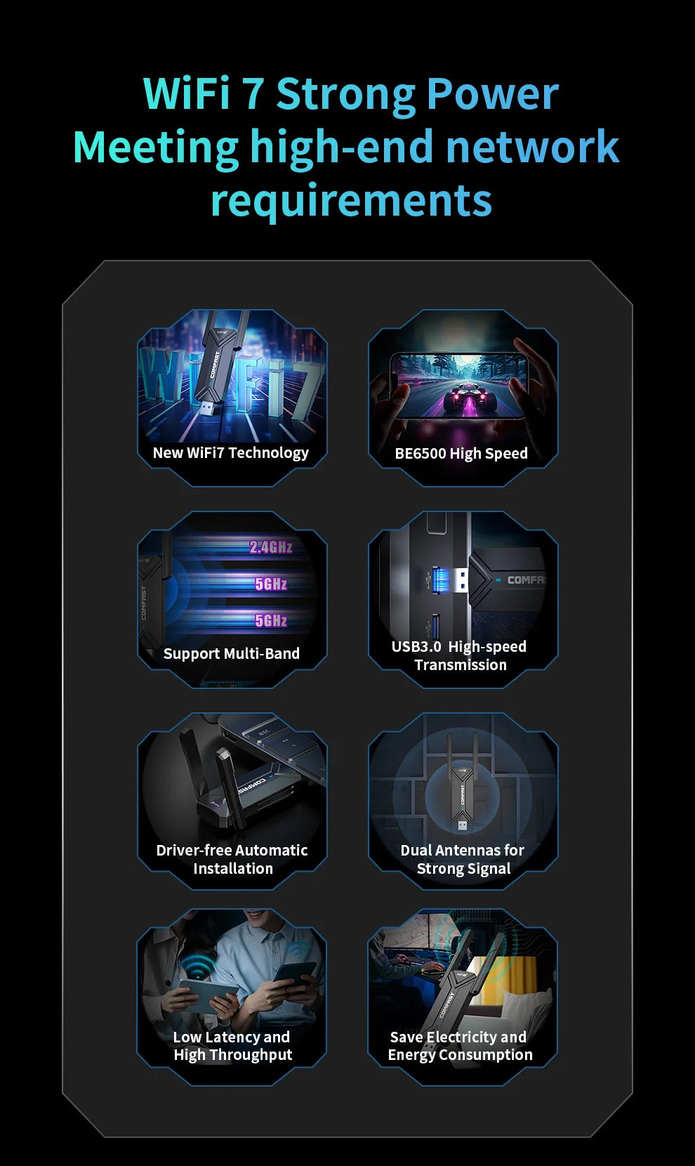 The Comfast USB WiFi7 Gigabit Network Card 6500Mbps USB Wi-fi adapter 2.4G/5.8G/6GHz Driver Free Wifi Dongle For PC Win10/11 CF-987BE CF-983BE is the product you didn't think you need, but once you have it, something you won't want to live without.
