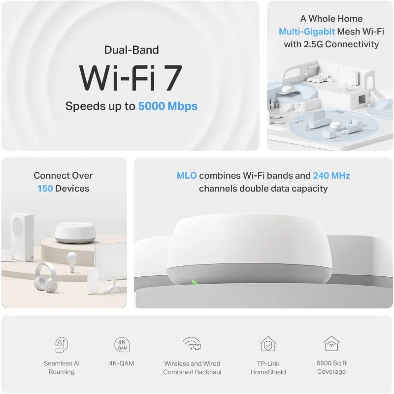 𝐒𝐮𝐩𝐞𝐫𝐜𝐡𝐚𝐫𝐠𝐞𝐝 𝐰𝐢𝐭𝐡 𝟒-𝐒𝐭𝐫𝐞𝐚𝐦 𝐃𝐮𝐚𝐥-𝐁𝐚𝐧𝐝 𝐖𝐢𝐅𝐢 𝟕 𝐮𝐩 𝐭𝐨 𝟓 𝐆𝐛𝐩𝐬 - Achieve full speeds of up to 4324 Mbps on the 5GHz band and 688 Mbps on the 2.4GHz band with 4 streams. Experience incredible performance⌂△ with Multi-Link Operation (MLO), 4K-QAM and Multi-RUs. Ideal for maximizing the capabilities of your latest WiFi 7 devices, including the 𝙣𝙚𝙬𝙚𝙨𝙩 𝙞𝙋𝙝𝙤𝙣𝙚 and gaming consoles.