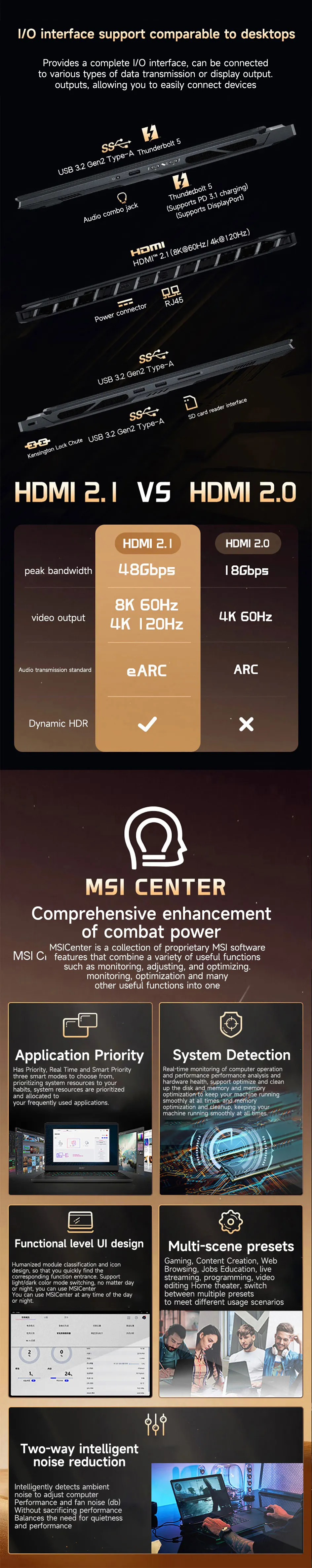 2x Thunderbolt 5 (DP/PD 3.1), 3x Type-A USB 3.2 Gen2,1x HDMI™ 2.1 (8K@ 60Hz / 4K@ 120Hz), 1x RJ45, 1x Mic-in/Headphone-out Combo Jack |