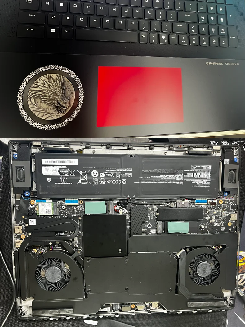 Randomly equipped peripheral devices, touchpads, cameras, various boards, cables, speakers, and other internal components of the machine. |