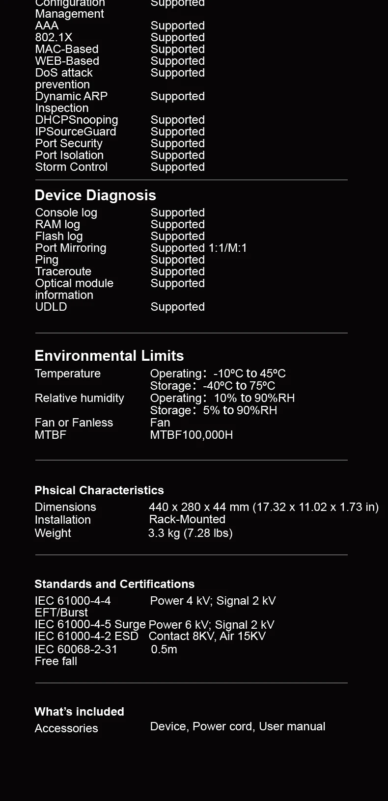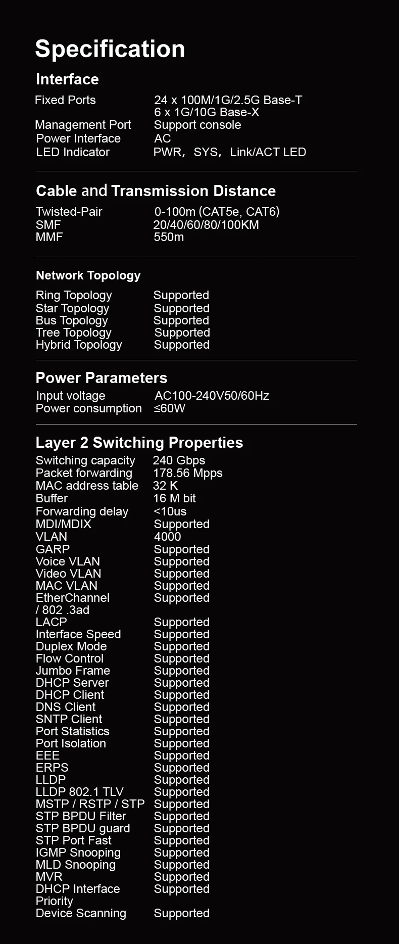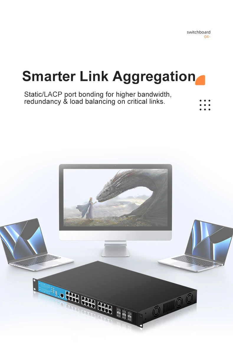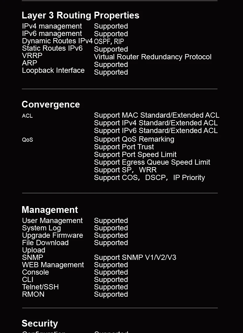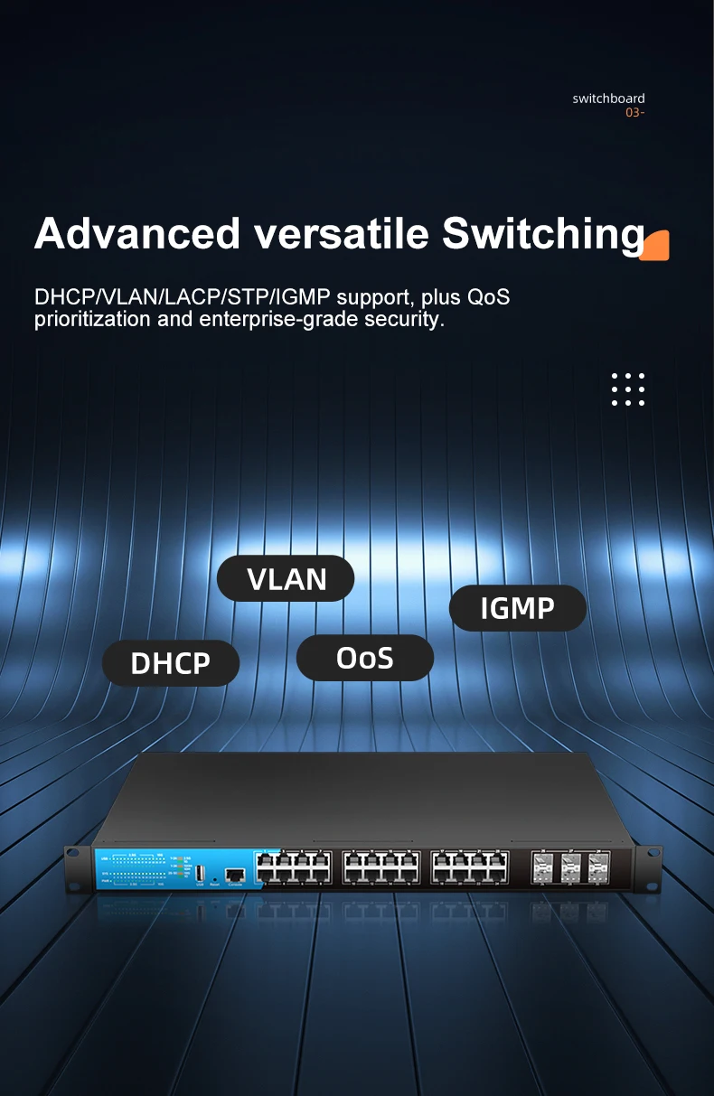 ✔ Advanced Layer 3 Management – VLAN, QoS, ACL, LACP, Static Routing, and more.