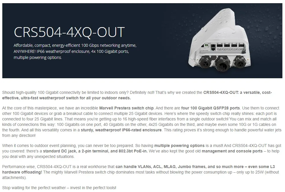 Should high-quality 100 Gigabit connectivity be limited to indoors only? Definitely not! That’s why we created the CRS504-4XQ-OUT: a versatile, cost-effective, ultra-fast weatherproof switch for all your outdoor needs.