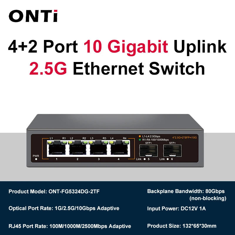 The ONTi 2.5GbE Switch 2.5GBASE-T 4 Port 2.5G RJ45 with 2 Port 10G SFP+ Fanless Plug&Play Network Switch Desktop Wall Mounted ONT-FG5324DG-2TF was built with people like you in mind. Something to keep you happy. Every. Single. Day.