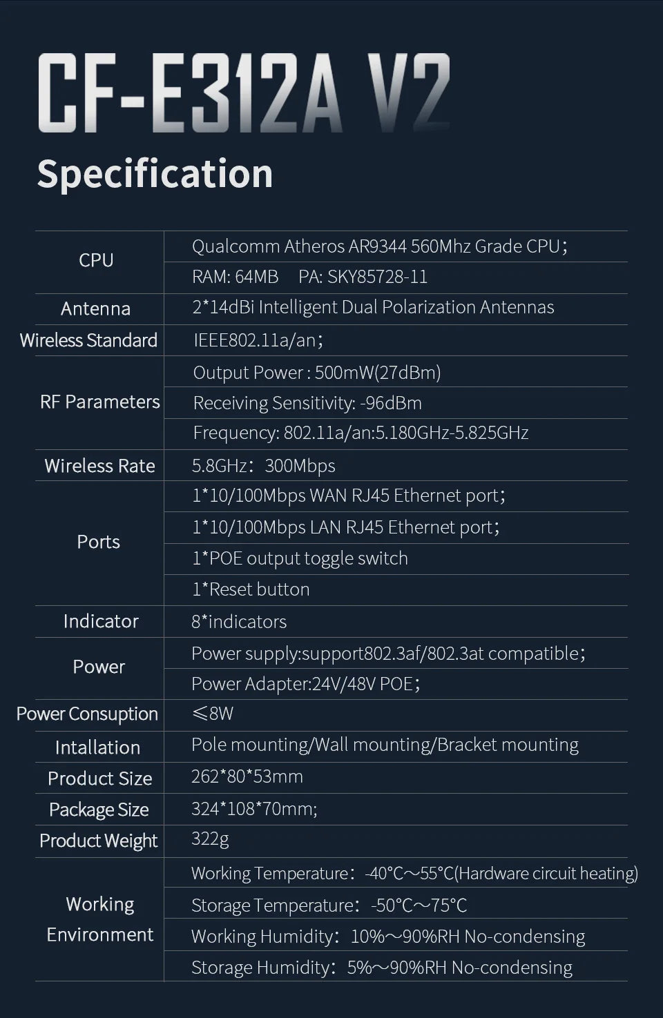 CF-312A V2 Adopt Qualcomm AR9344 chip, With PowerfulPA function and high gain antenna, Equipment performanceand transmission distance are more outstandingdue to high matching standards. The Actual no obstacles environment can up 5-10 kilometers