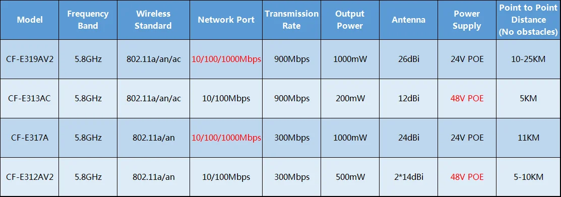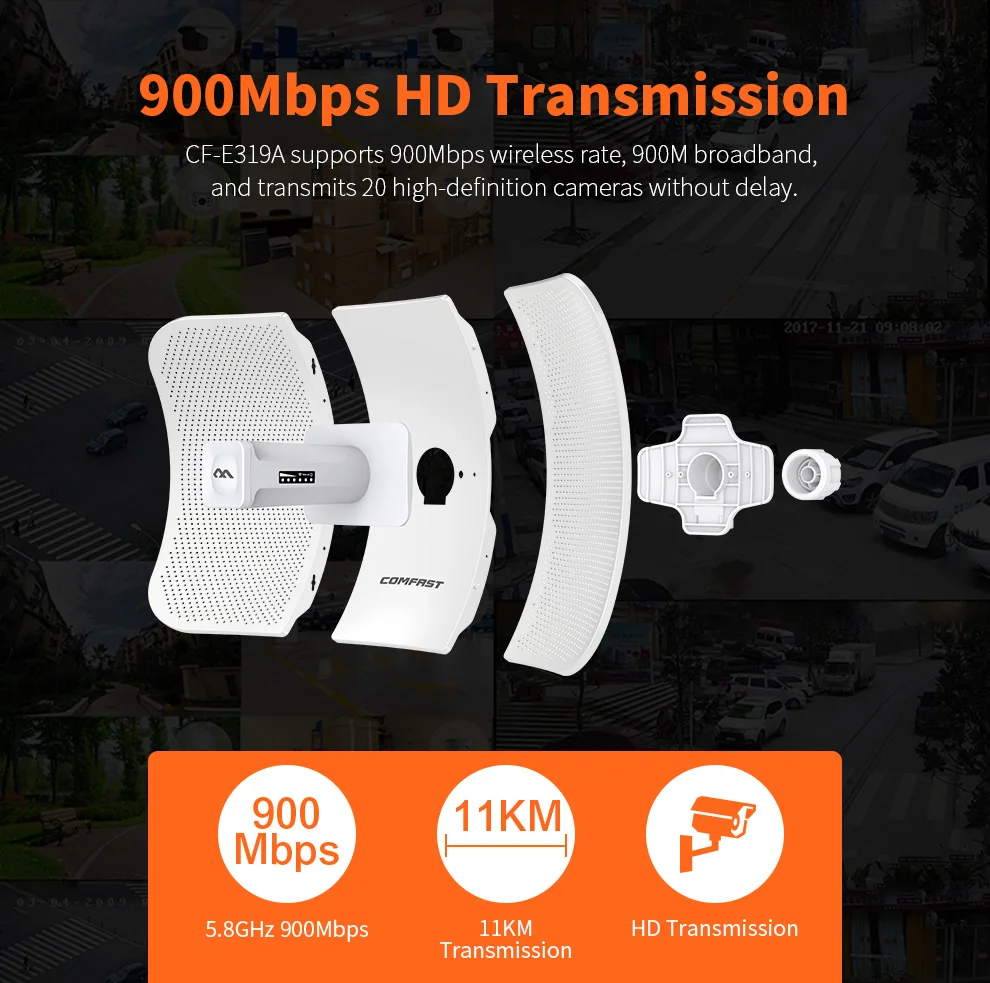 CF-E319A supports 900Mbps wireless rate, 900M broadband,and transmits 20 high-definition cameras without delay.Outdoor IP65 Rating Provides The Ability to Handle Different Kinds Of Rugged surroundings
