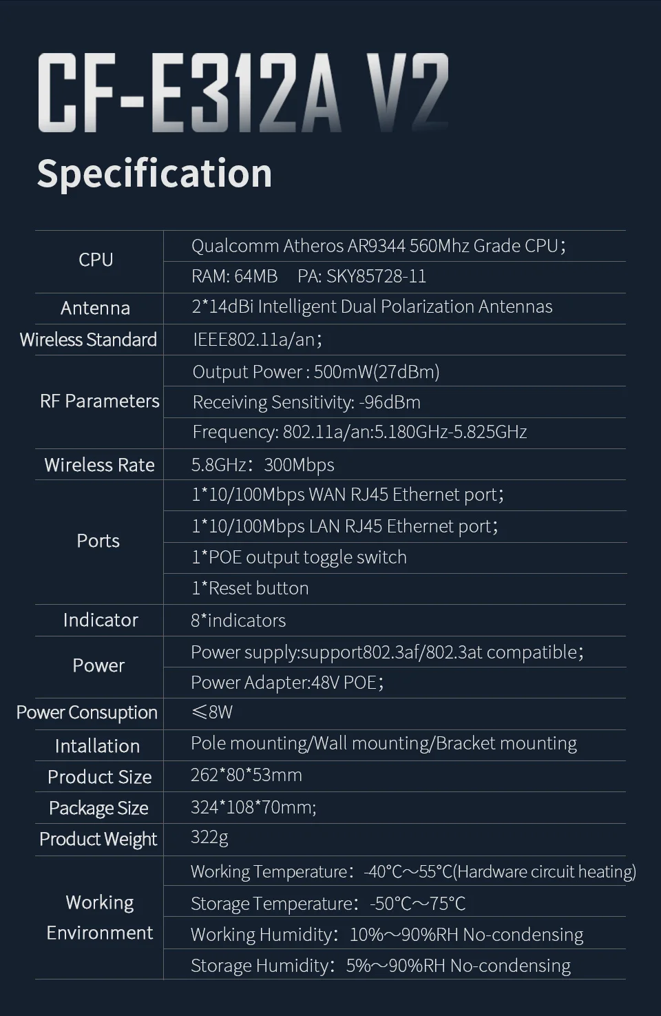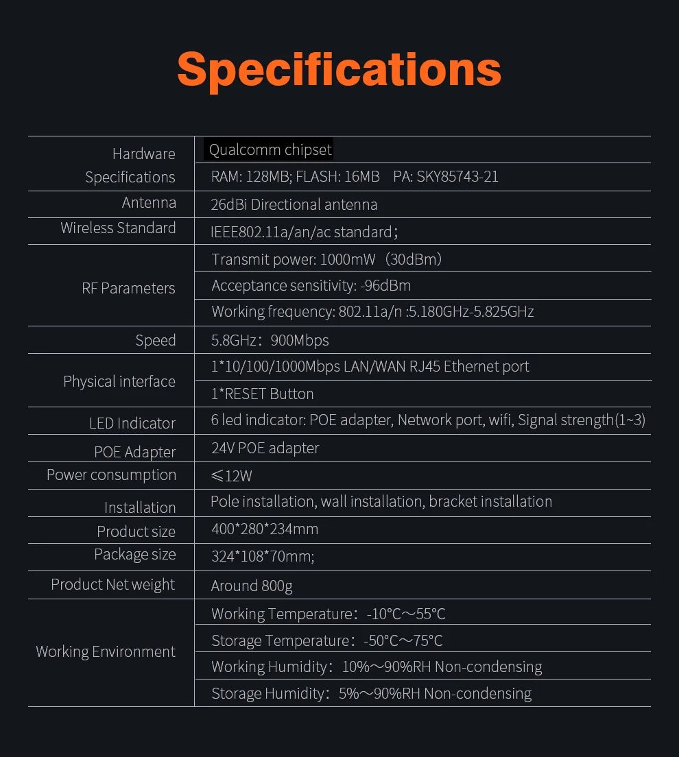 Working Frequency: 5.180-5.825GHz