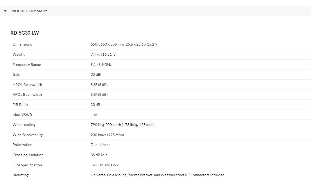 UBIQUITI RD-5G30-LW UISP airMAX RocketDish 5 GHz, 30 dBi LW Antenna Basestation Or Point-to-Point Bridge Or Network Backhaul