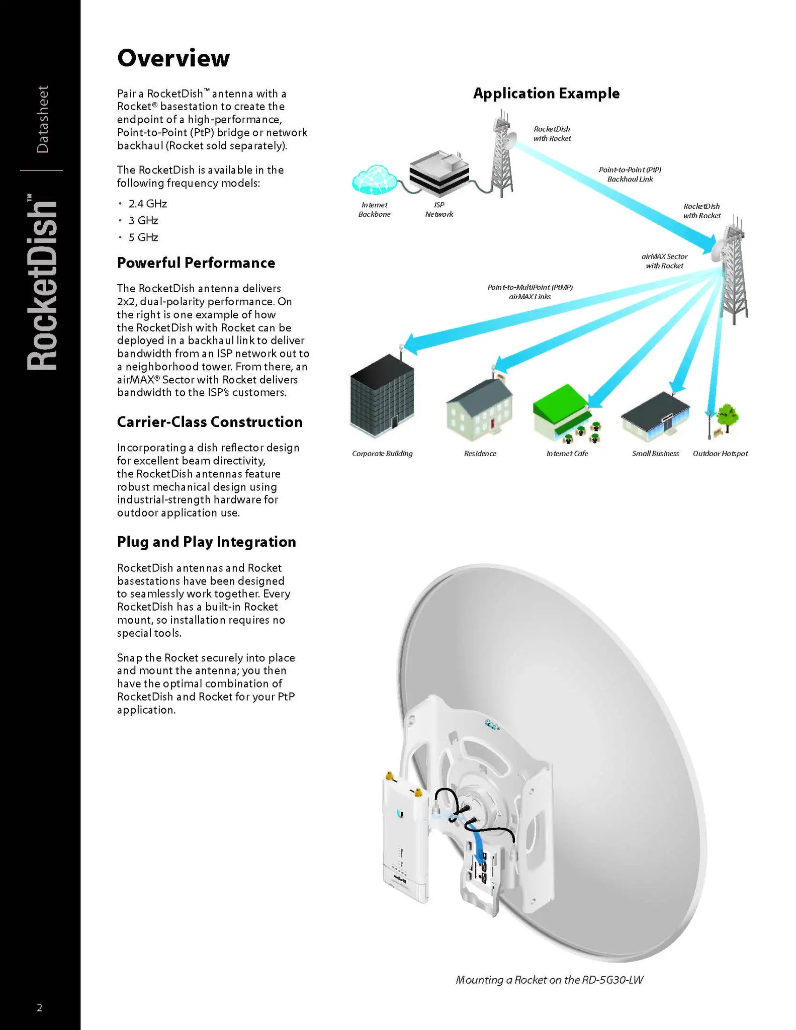 • Pair a RocketDish™ antenna with a Rocket® basestation to create the endpoint of a high-performance, Point-to-Point (PtP) bridge or network backhaul (Rocket sold separately). The RocketDish is available in the following frequency models:
