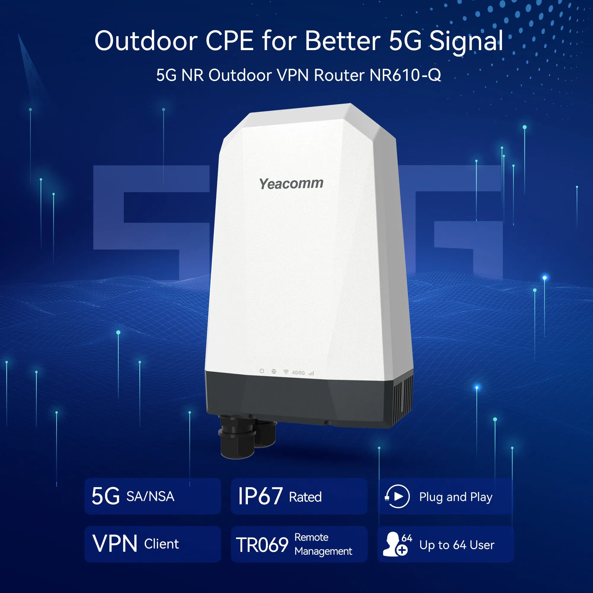 Yeacomm NR610-Q is a high speed Sub-6G 5G NR outdoor CPE specifically designed to meet integrated data needs for residential, business and enterprise users. In the service area of the 5GSub6/LTE/3G network, it enables wide service coverage and provides high data throughput and networking features to customers who needs easy broadband access.