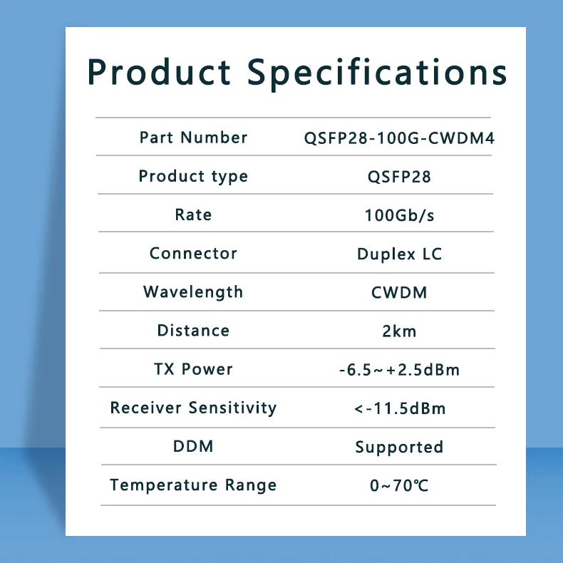 ● Transmitter: cooled 4x25Gb/s LAN WDM TOSA (1295.56, 1300.05, 1304.58, 1309.14nm)