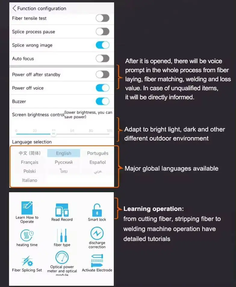 AI-9 adopts the latest core alignment technology, with autofocus and six motors, and is a new generation of fiber fusion splicer. This machine uses an industrial-grade quad-core CPU, which is fast and responsive. It is one of the fastest fiber fusion splicers on the market. It is equipped with a 5-inch 800X480 high-resolution screen for simple and intuitive operation; and a focus magnification of up to 300 times, making it It becomes very easy to observe the fibers with the naked eye. 5 seconds of extremely fast core-to-core splicing, 15 seconds of heating, and the work efficiency is 50% higher than that of ordinary splicing machines. The core components are all imported brands, with aviation metal body materials and exquisite craftsmanship details. Combining advanced technology and design, the new generation of optical fiber splicing splicer will bring you a reliable and comfortable user experience.