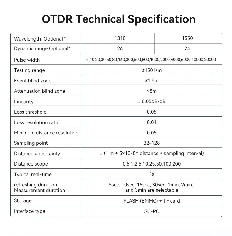 3. Measuring conditions of blind zone: reflection event is within 5KM, reflection strength is 45dB. Measured by the minimum pulse width.