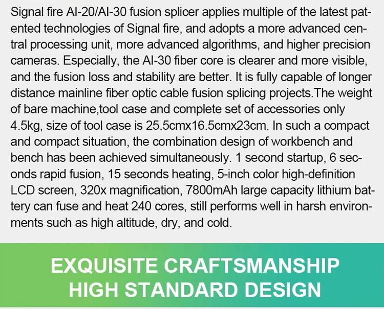 Imagine if you could be satisfied and content with your purchase. That can very much be your reality with the Signalfire AI-30 AI-20 AI-9 AI-6C AI-7C AI-6A AI-5 6 Motors Fiber Splicing Machine Fusion Splicer Complete Tool Kit 7800mAH lithium battery.