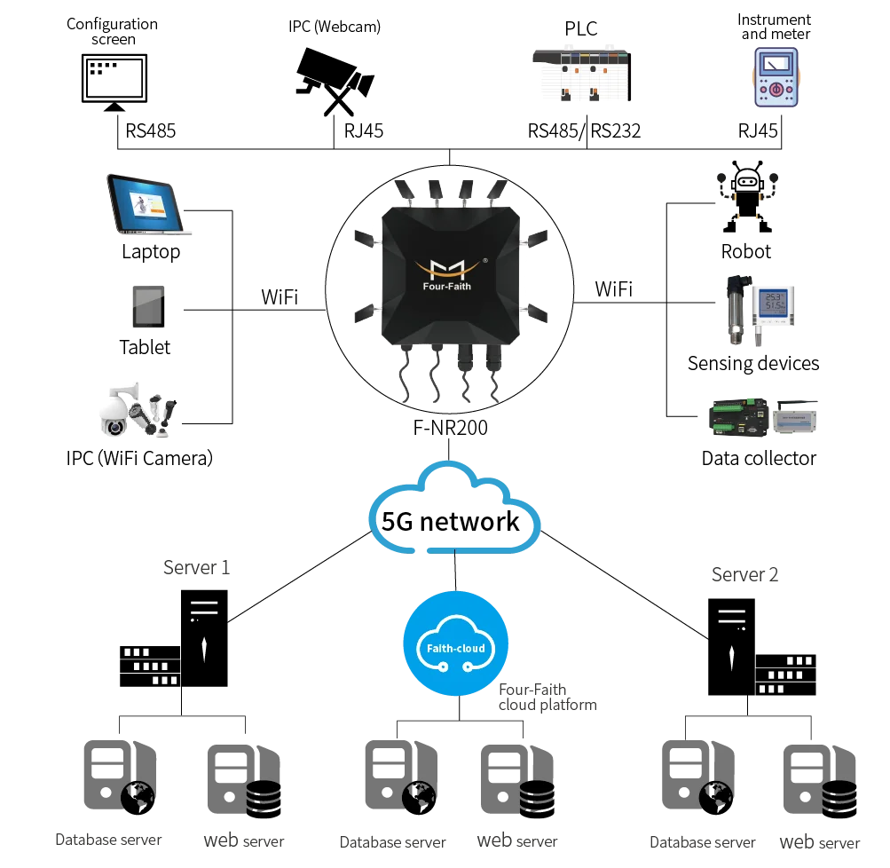 F-NR200 is a 5G industrial CPE that uses public 3G/4G/5G networks to provide users with wireless long-distance big data transmission functions. The product uses high-performance industrial-grade 32-bit communication processors and industrial-grade wireless modules, with embedded real-time operating system as the software support platform, and provides 1 RS232 (or RS485), 1 Ethernet LAN, and 1 Ethernet WAN, 1 optical fiber interface and support WIFI function, can connect serial device, Ethernet device and WIFI device at the same time, realize data transparent transmission and routing function.