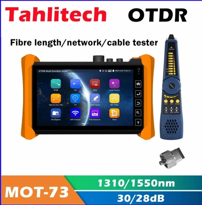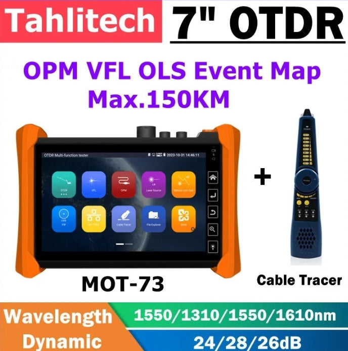 Multi-function MOT-73 OTDR is an essential tool for fiber length, network and cable testing. OTDR displays the power of the returned signal related to distance. The information can be used to confirm the transmission quality of a fiber optic link. It is widely used in the maintenance, construction and monitoring of cable line.