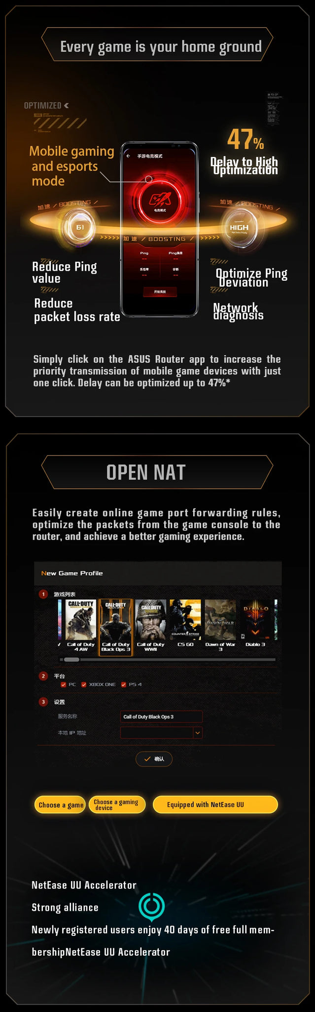 - One Router. All Game Types – Features Mobile Game Mode prioritization, a dedicated Gaming Port for peak performance, and simplified Open NAT for easy multiplayer setups.