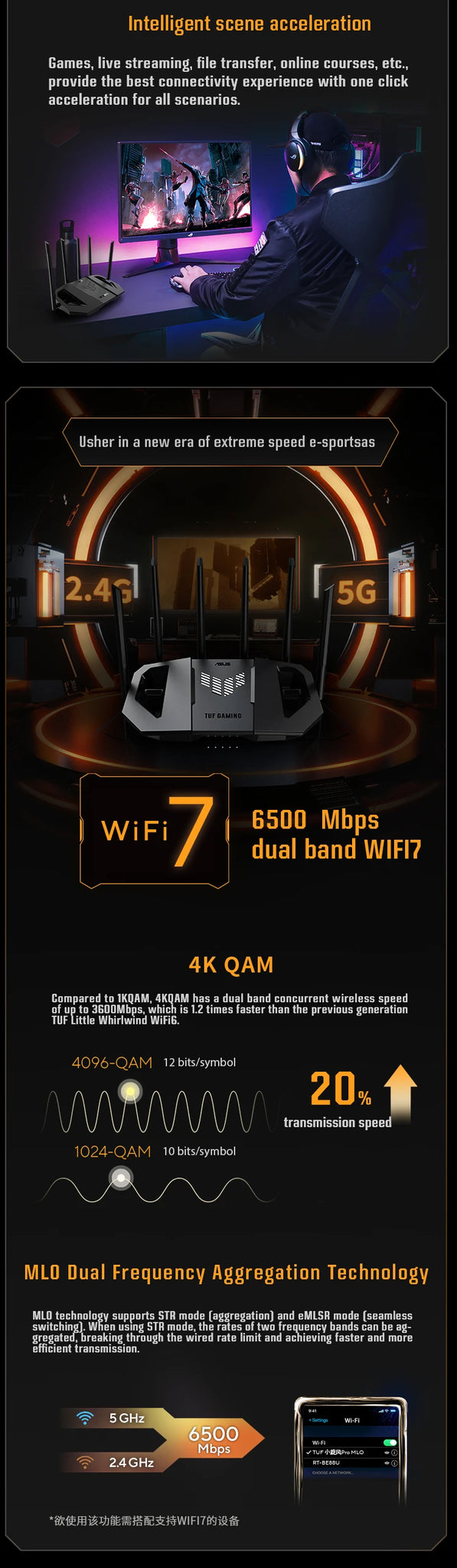 - 4K-QAM & Multi-Link Operation – WiFi 7 dual-band router delivers speeds up to 6500 Mbps. 4096-QAM boosts speed by 1.2X, and Multi-Link Operation (MLO) enhances stability and efficiency by connecting multiple bands simultaneously.