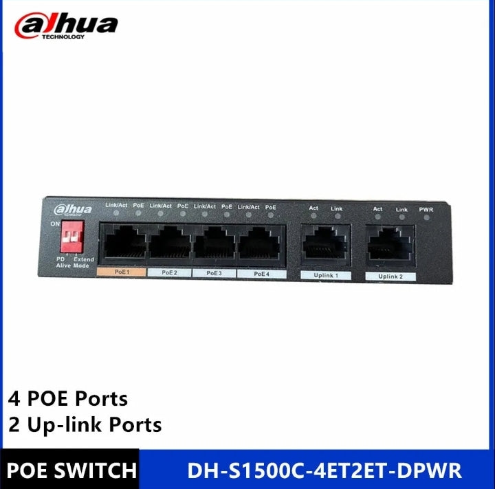 Dahua 4ch PoE Switch DH-S1500C-4ET2ET-DPWR 4CH Ethernet Switch with 250m Power Transit Distance Support PoE PoE+&Hi-PoE Protocol