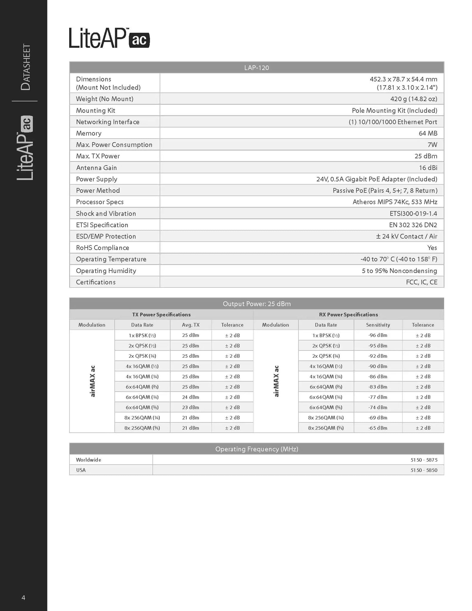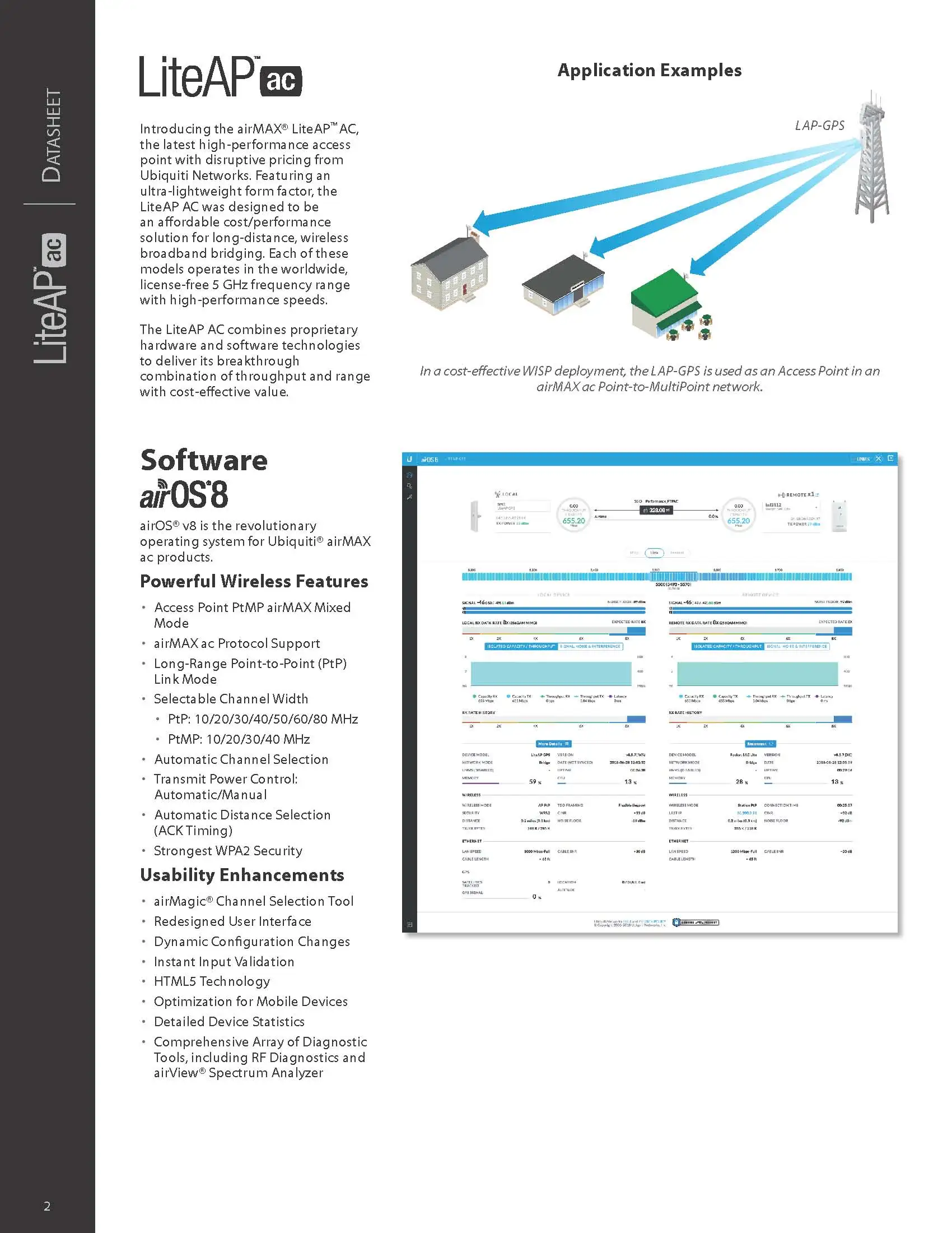Introducing the airMAX LiteAP AC, the latest high-performance access point with disruptive pricing from Ubiquiti. Featuring an ultra-lightweight form factor, the LiteAP AC was designed to be an affordable cost/performance solution for long-distance, wireless broadband bridging. Each of these models operates in the worldwide, license-free 5 GHz frequency range with high-performance speeds.